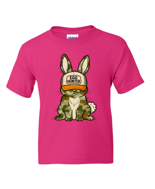 This youth graphic tee features a camo-print bunny rocking an "Egg Hunter" trucker hat. It’s the perfect gear for the kid who takes their Easter egg hunting seriously but wants to look cool doing it.