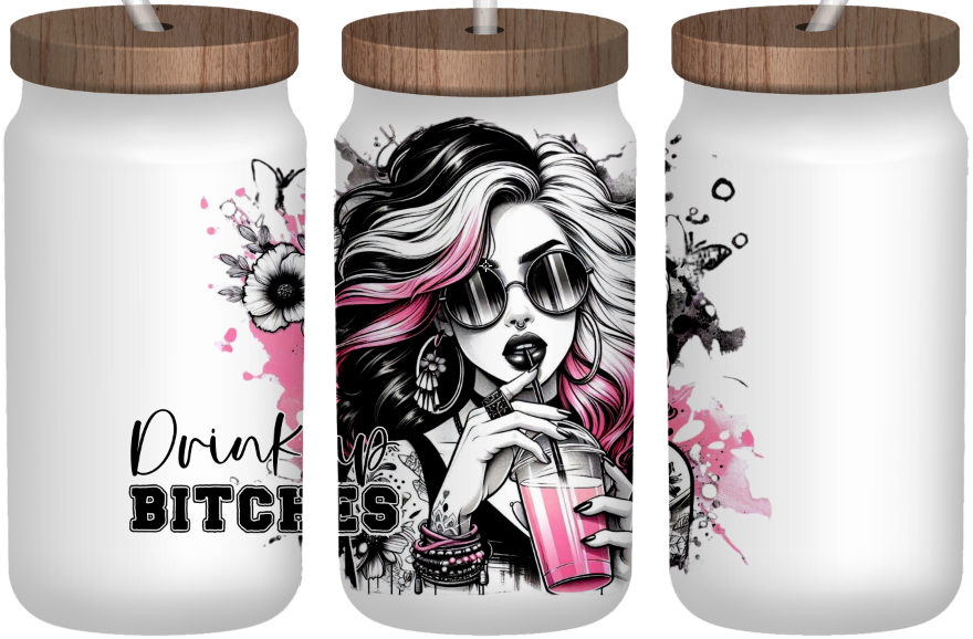 Drink Up B*tches | Frosted 16oz Glass Can – Bamboo Lid & Straw